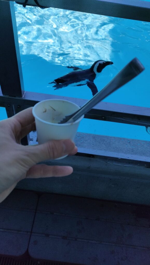 一人なので、食べている写真は撮れなかった(^_^;)けど、トングから魚を食べにくるペンギンが、可愛い。そして、あっという間に、なくなりました。